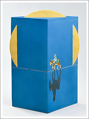 九谷焼の絵付けを新しく蘇生させたモダーンな表現には、目を見張るものがある。碧色の方形のボディの上部、左右に顔を出す月弧の形、ボディに刻された地平線を騎馬に乗る西域の人が渡り行く。立体に施された絵画的情景表現は見事である。
