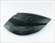 星雲間を飛行する宇宙船であろうか。シャープで未来的な広がりを持ち、器面に映る銀河宇宙は壮大で作者の心象をよく表している。