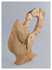 一本の木から削り出すのではなく、複数のパーツを組み合わせて作ることにより、より自由な造形表現に挑戦している。蛹から羽化する蝶の力む瞬間を捉え、自然界の厳しさと柔軟さを加えて表現し、柔らかな形体ながらも力強く新たに外界へ出る困難を乗り越える姿を、みごとに形態として表現した作品である。