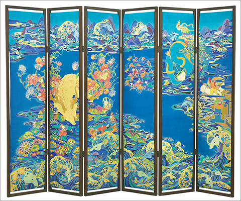 本格的な本友禅染の技法を用いて、中国神話をテーマに、独自性を有した物語に再構成し表現している。ダイナミックなスケールのある空間に個々の細やかなモチーフもちりばめられていて、屏風仕立ての効果も加わって見るものを飽きさせない。高度な糸目糊の技術と豊な巧みな配色も見事な秀作である。